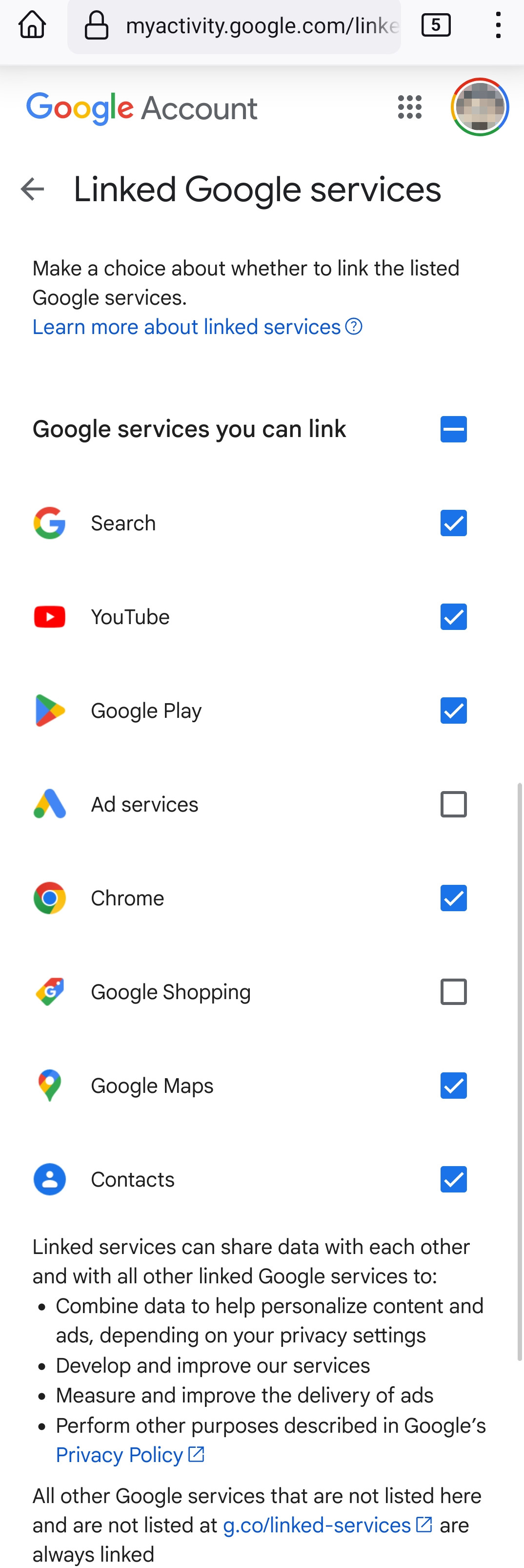 - Once there, you'll have the option to activate the services you need. In my case, I enabled all the services except for Shopping and Ad Services.